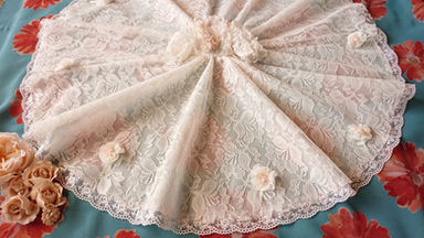 使用したレースはチュール刺繍レースで、ローズヒップティで淡いピンクに染めたりしています。